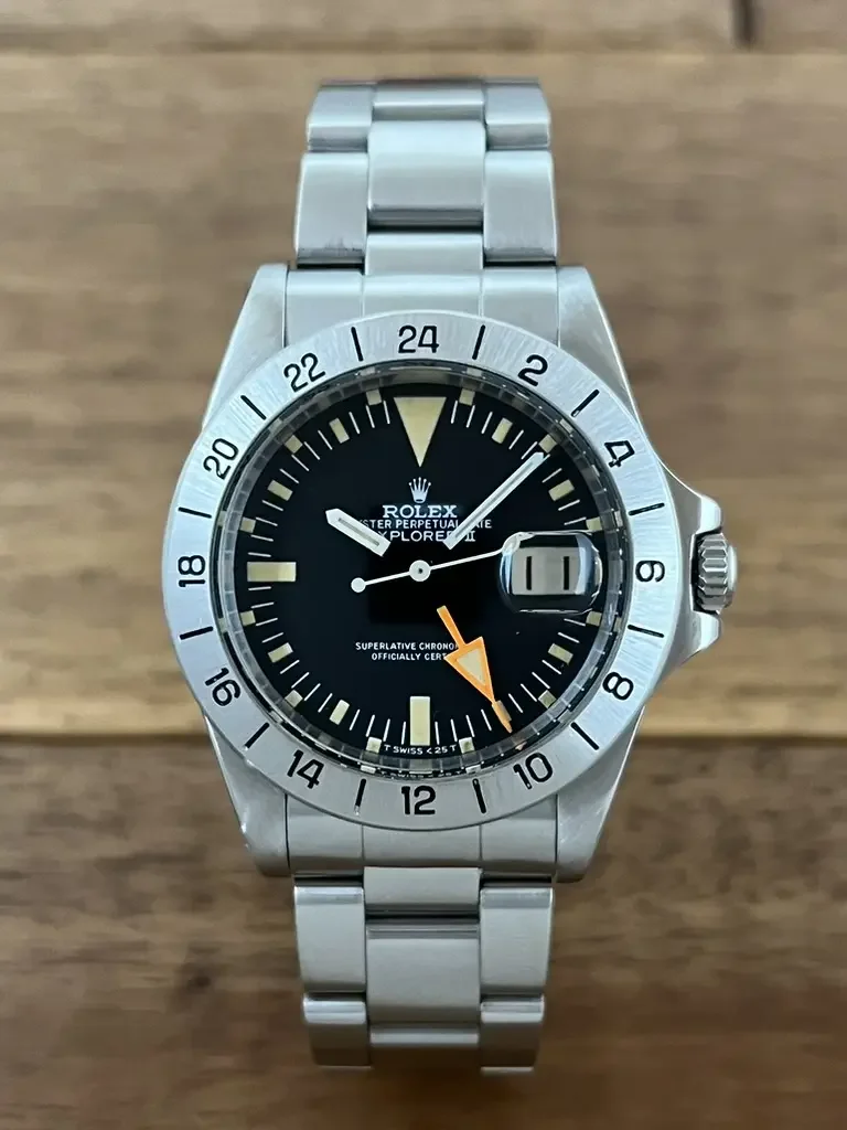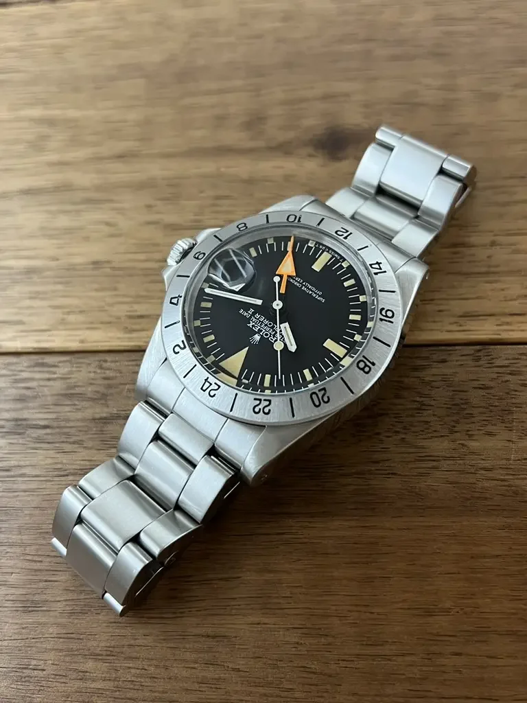 The dial’s tritium lume plots have taken on a beautiful patina and show no degradation under UV light inspection. The original tritium hands match the dial perfectly and show no degradation when inspected under UV light. The GMT orange hand has small watchmakers pinch mark.